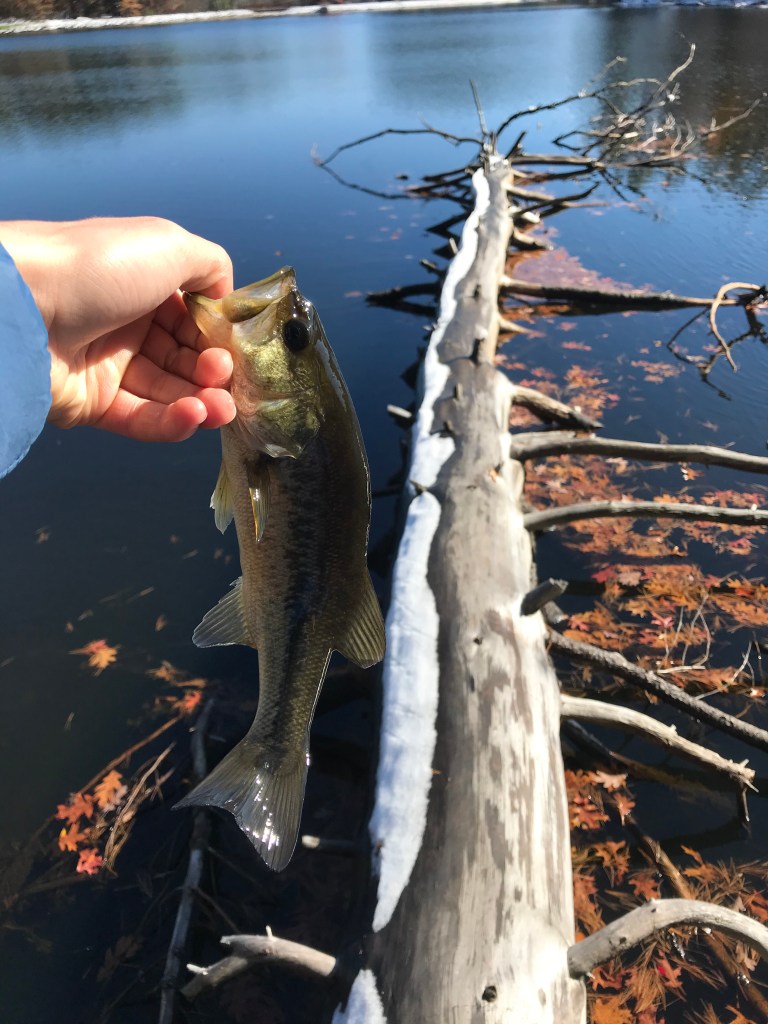 With my patience running thin, I tied on a black, brown, and light olive bead head wooly bugger. Having lost sight of the bass on the left side of the tree, I began casting on the right side, a risky move due to all the brush in the water. Cast after cast I snagged the leaves coating the surface, but eventually I felt a sharp tug. I snapped my rod tip up high, and stripped hard. The bass’s scales gleamed from just under the surface. I spun my reel to pick up the little line I had already stripped in, and began to fight him on the reel. Honestly, the fight wasn’t that spectacular. After another ten or so seconds, I simply lifted the fish into my frigid hand. The barbless hook popped right out, and after taking a quick picture, the fish was on its’ merry way.