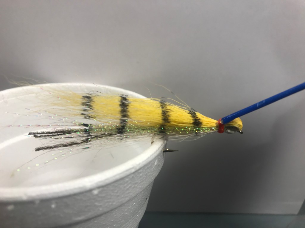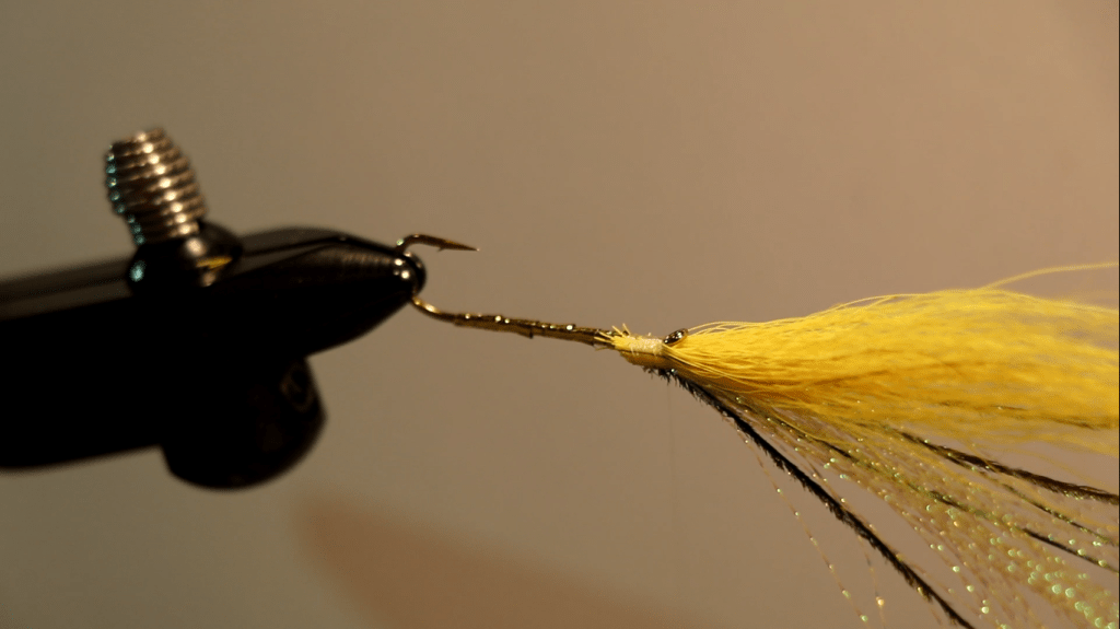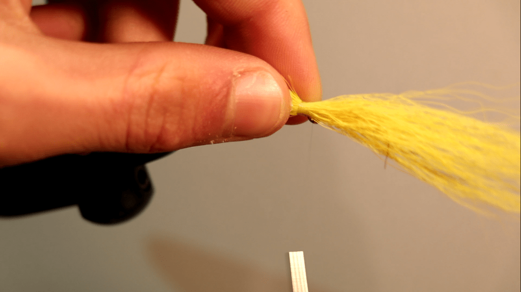 - Cut a large clump of yellow bucktail that is at least two-and-a-half hook shanks in length. You need enough hair to form a good looking head, but not so much that it begins to be overly bulky. This will come with experience. Starting slightly in front of the tinsel, tie in the bucktail facing towards the eye, stopping just before the eye. Clip the excess to form a small ramp that stops at the tinsel. Cover up this ramp with thread.