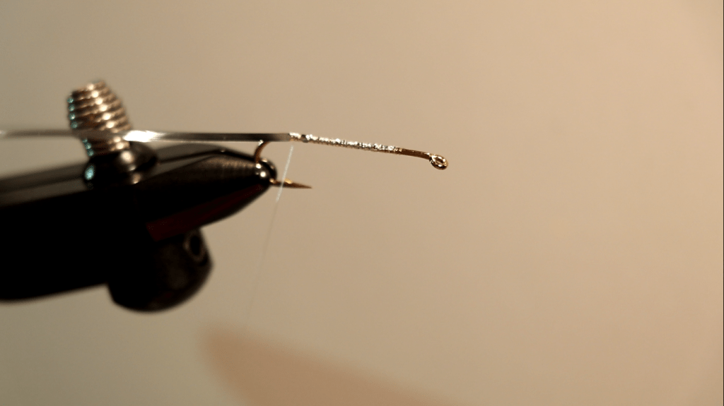 - Wind the tinsel forward to the initial tie-in point, pushing your thread along the way. Secure the tinsel and cut the excess. This doesn’t have to look perfect because it will mostly be covered up by materials in the end.