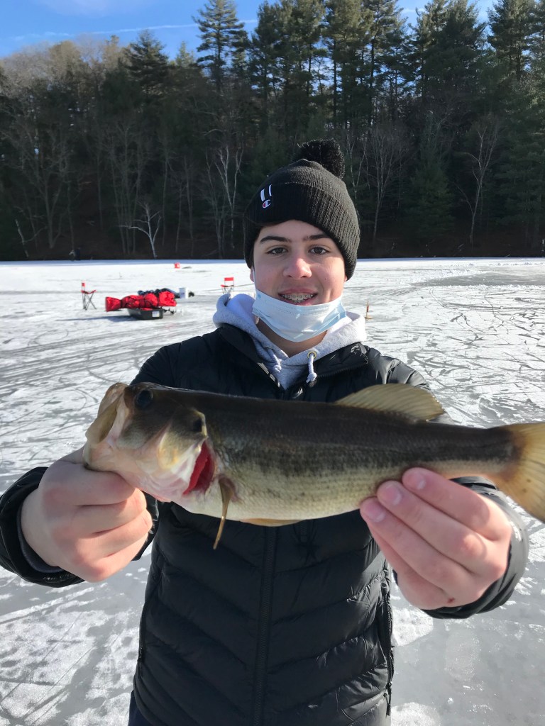 It was nearly an hour before we got our first flag. Actually, due to user error (yes, even I mess up some times), the flag never actually popped. It was more of a jiggle of the entire tip-up that alerted me to the fish on the line. There’s no better feeling than catching the first fish of the day before any of your other friends even get a bite. After a short and, dare I say, weak fight, a cookie-cutter sized bass emerged from the hole. I was elated to at last catch my first fish of 2021. And a bass, none the less!