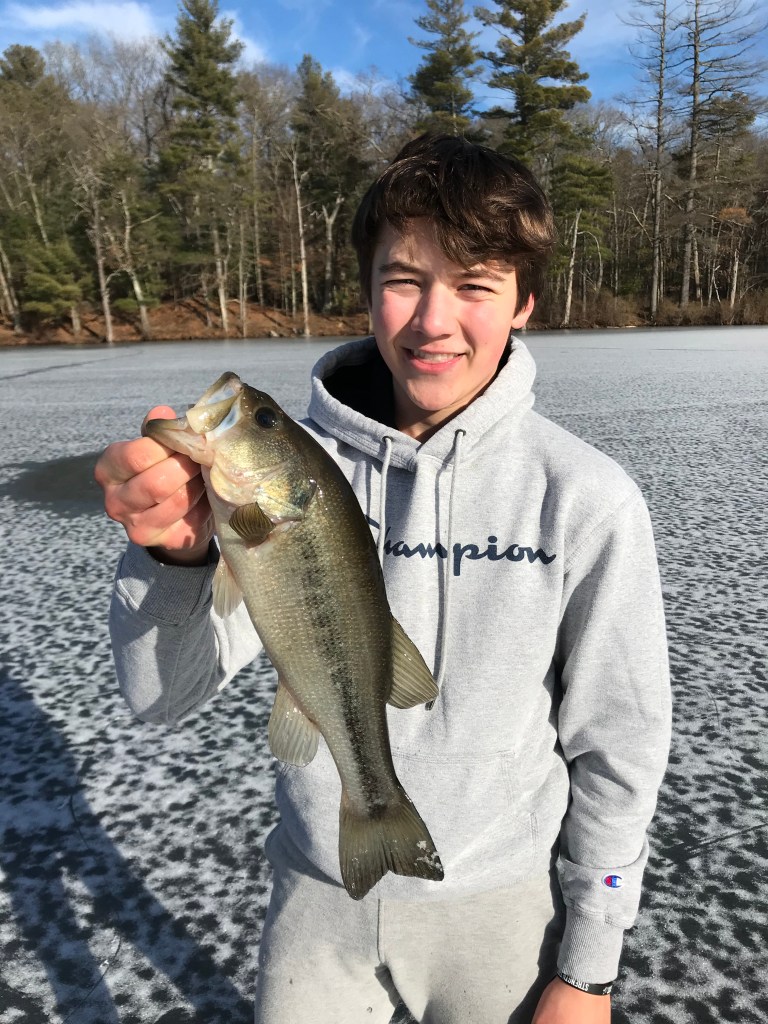 I was convinced the day couldn’t get any better. Two fish in less than two minutes? Unbeatable. I grabbed my jigging rod rigged with a marabou jig and a shiner head and dropped it down until I felt bottom. When I felt my line go slack, I closed the bail and slowly reeled it off the pond floor. I didn’t get far, though, before the rod doubled over. Unprepared, I clumsily set the hook, and fumbled to get my hand on the reel. I couldn’t believe it! I lifted my second largemouth of the day into my hand, and looked at my friend. Lo and behold, his rod was now bent over as well! It truly was prime time. He grabbed his first fish of the day, a decent bass. We just looked at each other and laughed. We hadn’t had fishing this great since the summer.