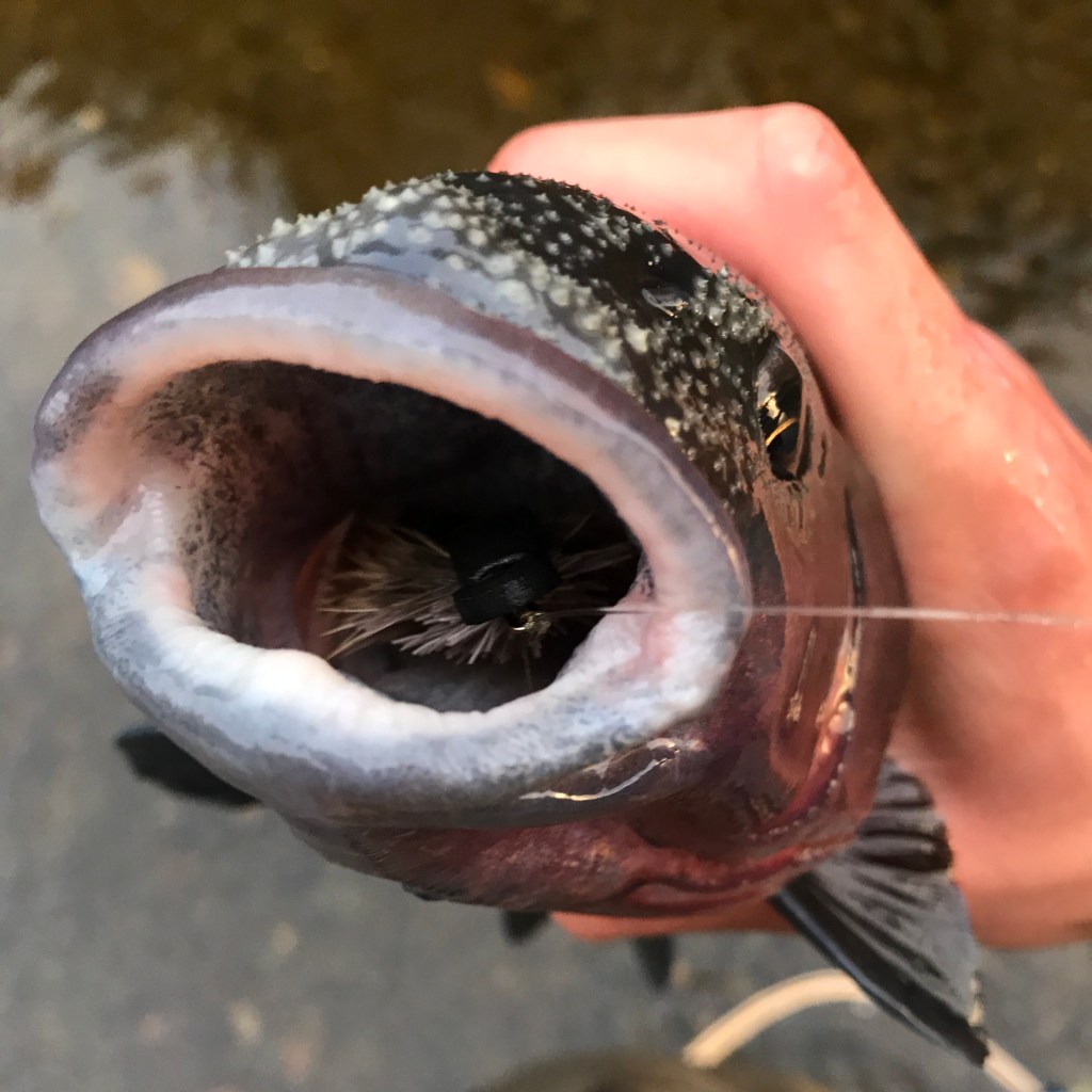 In order to ascertain whether or not there were actually any fish in the pool, I started out with a confidence pattern, the blacknose dace streamer. Before long, I felt like I was snagged, but once I felt head shakes, I knew I was hooked into something big. About ten seconds into the fight, not having made any progress, my line went limp. I was devastated, especially since I didn’t even know what species it was. For all I knew, it could have been a four-pound brook trout. I casted again, hoping whatever it was would come back. And it did, but not for long. After the second missed fished, I figured something must be wrong with my hook. I took out my hook file (a must-have tool for any angler) and quickly touched up the point.