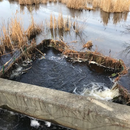 A wire Beaver Deceiver has been installed at the head of the flood control structure to prevent the damming of the brook. Unfortunately, wire Beaver Deceivers dissuade fish from passing, creating an additional barrier for herring.