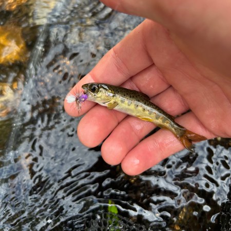 The brook looked just like many others I’d fished throughout the state, yet one difference was glaringly obvious: the clarity of the water. The water was nearly as pure as the crystal waters of the Swift, but the size of the fish wasn’t quite the same. Cast after cast with my size 14 Purple Haze and Will’s size 10 Stimulator induced hearty takes from hungry fish, yet after about 15 rises, we still hadn’t hooked one. Schools of diminutive minnows swam all around us, but if there were fish of any substance, they must have been lurking deep in the shadows.