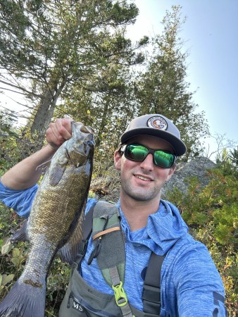 In the blink of an eye, I had released the salmon (into a side channel where it could recover) and tied on a streamer. After pitching the fly back into the current, my rod instantly doubled over again. This time a smallmouth put on a display of acrobatics, though I cut the fight short in hopes of getting my fly back in the action. I gently cradled the bass in the water to unhook it, keeping my sights set on a much larger fish just a few feet away. Suddenly the larger fish disappeared from my vision. “Ow!” I yelped startlingly, though I struggled to comprehend what had caused the outburst. Returning my gaze to the bass I was unhooking, I was shocked to find the larger fish latched onto my thumb. The fish had bit me! Never in my life had I encountered such aggressive fish.